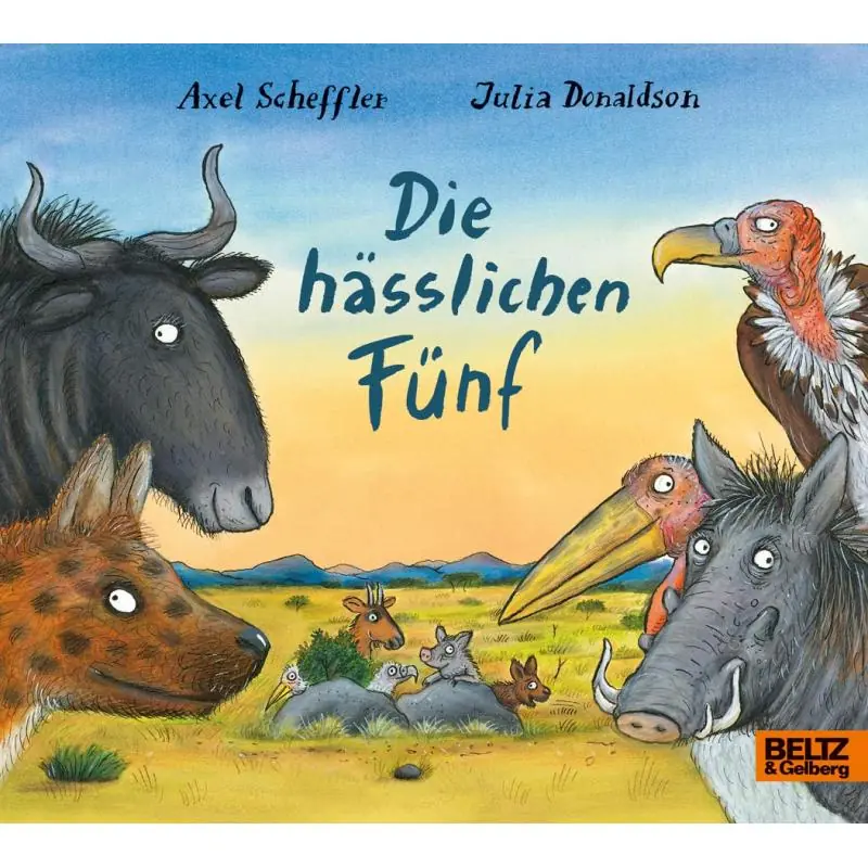 Sie gelten als die die 'hässlichen Fünf' der afrikanischen Wildnis: das hässliche Gnu, die scheußliche Hyäne, der kahle Geier, das borstige Warzenschwein und der bucklige Marabu. Bei Julia Donaldson singen und stapfen die hässlichen Fünf glücklich durch die Welt. Denn sie wissen längst, was ihre Kinder gerne rufen: 'Ihr fünf seid so schön, seid die Besten der Welt!' Auf jeden Fall wurden sie noch nie so zauberhaft gereimt wie von Julia Donaldson und so wunderschön gezeichnet wie von Axel Scheffler. Ein Bilderbuch zum Vorlesen von den Schöpfern des weltberühmten 'Grüffelo'.