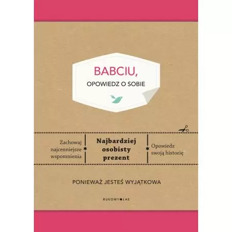 Darowując książkę „Babciu, opowiedz o sobie”, dajesz swojej Babci więcej niż pięknie wydaną, ładnie oprawioną, nienapisaną jeszcze historię. Dajesz jej poczucie, że jest dla Ciebie ważna. Dzięki odpowiedziom na proste i wnikliwe, zawarte w dzienniku pytania dajesz babci możliwość spisania losów, wspomnień i przelania uczuć co sprawi, że dotąd puste strony dziennika staną się dla niej podarunkiem bardzo osobistym, a dla Ciebie i całej rodziny będą stanowić bezcenną pamiątkę.
