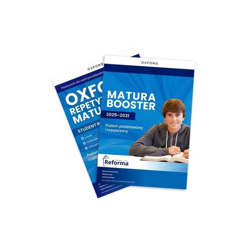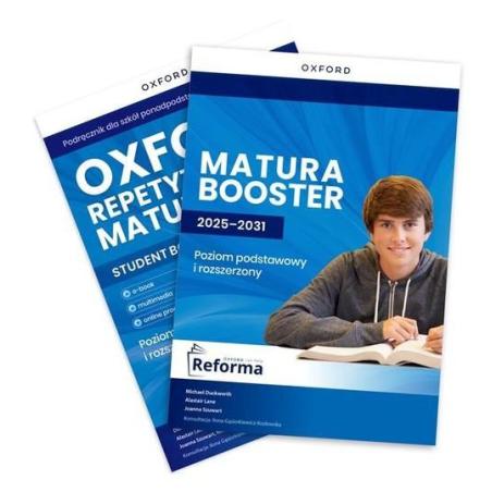 Oxford Repetytorium Maturzysty. Poziom podstawowy z elementami rozszerzenia z dodatkiem Matura Booster i Online Practice (dopuszczenie MEN) Oxford Repetytorium Maturzysty to elastyczny i nowoczesny kurs dla uczniów szkół ponadpodstawowych, który kompleksowo przygotowuje do egzaminu maturalnego w nowej formule.Nowość! Od roku szkolnego 2024/25 repetytorium zawiera dodatkowy komponent - Matura Booster 2025–2031, w którym znajduje się bogaty pakiet zadań przygotowujących do nowej matury, w tym zadania na rozumienie ze słuchu, znajomość środków językowych oraz tworzenie wypowiedzi pisemnych, a także nagrania audio, modelowe prace pisemne oraz przykładowy ustny i pisemny egzamin.Zalety kursu: Pomaga osiągnąć sukces na maturze Zawiera wszystkie rodzaje zadań obowiązujące na egzaminie od 2023 roku Oxford 3000 i Oxford 5000 – lista starannie wyselekcjonowanych, najczęściej używanych i najbardziej przydatnych słów, opracowana przez oksfordzkich leksykografów Rozbudowane sekcje rozwijające znajomość środków językowych Wordpower – dodatkowe zadania leksykalne utrwalające m.in. idiomy, kolokacje i wyrażenia czasownikowe Brainpower – leksykalne powtórki kumulatywne i strategie efektywnego zapamiętywania Umożliwia stosowanie nowoczesnych rozwiązań Podręcznik z interaktywnym e-bookiem Dodatkowe zadania Online Practice i wideo ze wskazówkami egzaminacyjnymiPomoce dla nauczyciela:Classroom Presentation Tool oraz zasoby cyfroweTeacher Resources Online Practicedzięki nagraniom oraz interaktywnym zadaniom umożliwia uczniom doskonalenie sprawności językowych w angażującej formie pomaga doskonalić poprawną wymowę dzięki zadaniom z opcją „wysłuchaj, nagraj i odtwórz” pozwala na nieustanne śledzenie postępów uczniów i ocenienie dzięki automatycznym raportom umożliwia wykorzystanie komputera lub urządzeń mobilnych do łatwej i przyjemnej powtórki materiałuMatura Booster - dodatkowe zadania na rozumienie ze słuchu i znajomość środków językowych w formacie egzaminacyjnym na poziomach podstawowym i rozszerzonym - przykłady modelowych prac pisemnych i dodatkowe zadania na tworzenie wypowiedzi pisemnej w formatach egzaminacyjnych kompletny ustny i pisemny egzamin maturalny na poziomie podstawowym