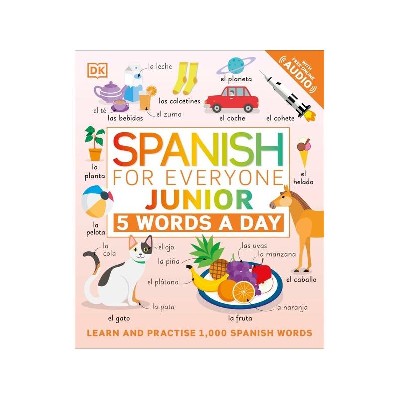 Help your child master Spanish vocabulary - five words at a time!Learn 1000 Spanish words over a year with this Spanish workbook for beginners! It's an essential vocabulary builder for young children who are starting to learn their first Spanish words.Discover the perfect introduction to Spanish for children aged 6-9. It's the ultimate Spanish lesson for kids! It includes:- Beautifully illustrated scenes that teach and test five words at a time. New vocabulary is practised again at the end of each week in two pages of exercises - Clever flaps on the jacket that cover the scene so your child can practise what they have just learned - Uses the effective rote-learning method to teach new vocabulary - Teaches a range of nouns and verbs that are useful in everyday life; audio is available online and via a handy app to help with pronunciationThis unique Spanish teaching guide contains everything your child needs to acquire a firm grasp of the Spanish language in a fun and interactive way! Each week, 20 new words are presented over four days, and on the fifth day, your child can practise the words they have just learned. This will help them build up a vocabulary of more than 1000 Spanish words over the course of a year!From animals and sports to colours and plants, Spanish for Everyone Junior teaches a mix of nouns and verbs through stunning illustrations with each new word clearly labelled. This encourages young learners to memorise the words before covering them with the cleverly designed flaps and testing their new knowledge. Accompanying audio means that children can also practice their Spanish pronunciation as many times as they want.The colourful, clear and comprehensive 5 Words a Day series from DK lays the foundations for your child's journey in learning a foreign language, at school or home. Look out for other workbooks in the series! Help your child learn, practise, and understand 1000 French words in French for Everyone Junior: 5 Words a Day.