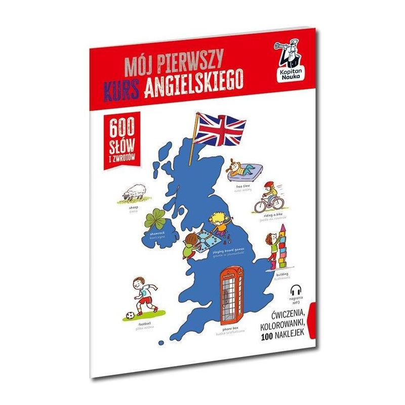 Zacznij przygodę z angielskim i poznaj najważniejsze słówka i zwroty. Mój pierwszy kurs angielskiego krok po kroku wprowadzi cię w świat angielskiego słownictwa i pomoże w skutecznym zapamiętywaniu. Specjalnie dobrane łamigłówki zachęcą do samodzielnej nauki początkujących użytkowników języka angielskiego niezależnie od wieku. Książka zawiera: ponad 600 słów i zwrotów przydatnych w codziennej komunikacji, ćwiczenia i łamigłówki pomagające utrwalić wiedzę, pełne szczegółów ilustracje do wyszukiwania i kolorowania, ponad 100 naklejek zachęcających do samodzielnej nauki, nagrania MP3 profesjonalnych lektorów pozwalające ćwiczyć poprawną wymowę. Jak po angielsku życzyć komuś „wszystkiego najlepszego”? Jak nazywają się członkowie dalszej rodziny? Jak zapytać o drogę i kupić bilet, jak zapłacić w sklepie, a jak poprosić o pomoc? Mój pierwszy kurs angielskiego pomoże poznać i zapamiętać podstawowe słowa i zwroty przydatne w codziennych sytuacjach. Ćwicz praktyczne wyrażenia i dogaduj się łatwiej! Kapitan Nauka to marka, która wspiera rozwój dziecka przez kreatywną zabawę. Nasze produkty dostosowane są do potrzeb maluchów, przedszkolaków oraz uczniów i rozwijają kluczowe umiejętności m.in. nauki mowy, czytania, liczenia czy mnożenia. Są świetną alternatywą dla smartfona czy komputera, a czas spędzony przy wspólnych rozgrywkach, w gronie rodziny lub rówieśników wzmacnia więzi i umiejętności komunikacyjne. Nad zawartością merytoryczną czuwają eksperci: nauczyciele, pedagodzy, psycholodzy i terapeuci.