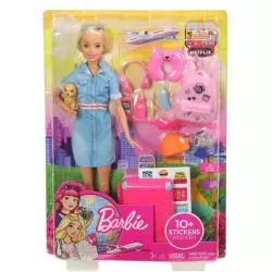 Lalka Barbie ma ze sobą ukochanego szczeniaczka jako towarzysza podróży i różową walizkę, która otwiera się i zamyka – jest nawet wyposażona w wysuwany uchwyt, tak jak prawdziwy bagaż. Ponadto, zestaw podróżny zawiera arkusz naklejek, które można wykorzystać do udekorowania walizki i udokumentowania podróży.