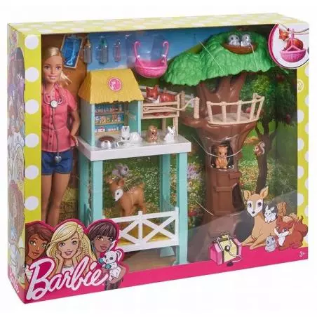 Lalka Barbie uwielbia zwierzęta, więc tworzy centrum ratunkowe, aby zapewnić im właściwą opiekę! Ten zestaw jest idealną propozycją dl młodych miłośników zwierząt, a to dzięki ośmiu figurkom milusińskich, dzięki którym zabawa staje się jeszcze bardziej wciągająca. Znajdują się tutaj: jeleń, lis, dwie wiewiórki, dwa króliczki i dwie sowy. Estetyka lecznicy nawiązuj do przyrody. Dwupoziomowy budynek charakteryzuje się żywymi barwami, połączony jest z z drzewem przy pomocy mostu liniowego, w razie potrzeby można przymocować do niego kosz dla zwierzaków. Samo drzewo stanowi też dom i schronienie dla podopiecznych Barbie. Centrum ratunkowe pokrywa strzecha, nadająca budynkowi charakteru. W domku Barbie znajdzie potrzebne medykamenty, a poniżej wygodne łóżeczko dla swoich pacjentów. Lalka ubrana jest w komfortowe wdzianko, na które składają się koszula z kołnierzykiem, dżinsowe szorty i buty. Stetoskop, dwie butelki i miska na karmę pomogą jej dbać o zwierzęta. Wejdź z Barbie w fascynujący świat opieki nad zwierzakami.