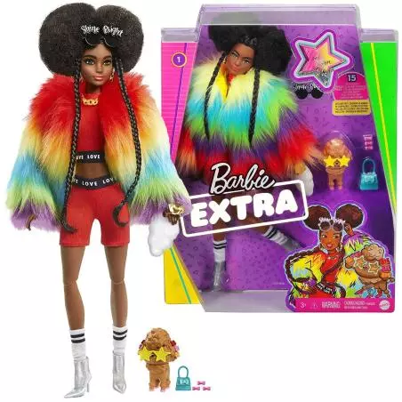Barbie Lalka Extra #1 brunetka z fryzurą afro z warkoczykami, futrzanym tęczowym płaszczykiem, pudelkiem, strojem i akcesoriami, w tym okularami przeciwsłonecznymi, lalka z wieloma punktami zgięcia.