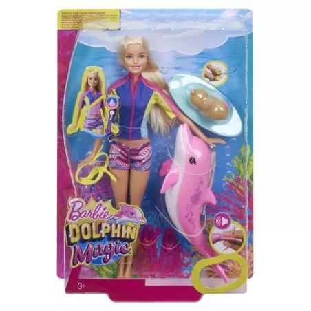 Przeżyj przygody inspirowane filmem Barbie Delfiny z Magicznej Wyspy razem z Barbie i jej słodkimi przyjaciółmi! Barbie ubrana jest w kolorowy top i szorty z nadrukiem. Już nie może się doczekać, kiedy zanurkuje w oceanie wspaniałej zabawy! Wow! Przy kontakcie z ciepłą wodą kamizelka lalki zmienia kolor z niebieskiego na różowy! Siedzący na desce surfingowej i psikający wodą szczeniaczek chętnie dołączy do zabawy! Ależ słodko wygląda z tą różową kokardką. Załóż maskę do snorkelingu oraz płetwy do nurkowania i pozwól Barbie odkrywać ocean w towarzystwie jej przyjaciela delfina. Naciśnij ogon delfina, aby usłyszeć realistyczne odgłosy, dzięki którym ta tropikalna przygoda stanie się jeszcze ciekawsza. Wielbicielki wakacyjnych przygód pokochają odgrywać ulubione scenki i opowiadać własne historyjki zarówno nad, jak i pod poziomem morza, bo z Barbie możesz być kim chcesz.