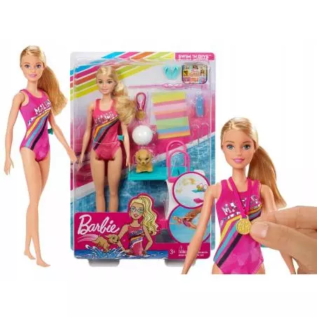 Dzieci mogą zanurzyć się w świecie wyobraźni podczas zabaw z lalką Barbie pływaczką – ubraną w kolorowy sportowy strój kąpielowy z paskami i połyskującymi akcentami. Gdy Barbie będzie gotowa dać nurka do wody, naciskaj przycisk na jej talii, by zobaczyć, jak macha nogami – zupełnie jakby „pływała”! Postaw pieska na trampolinie basenowej, aby zobaczyć, jak robi salto. A gdy napełnisz go wodą, stanie się psikawką! Możesz wymyślać niezliczoną liczbę historyjek: załóż gogle lalce Barbie i spróbuj wykonać doskonały skok lub pobaw się piłką. Po zakończonych zawodach możesz wręczyć Barbie pływaczce złoty medal, włożyć jej klapki i położyć ją na ręczniku, aby odpoczęła.