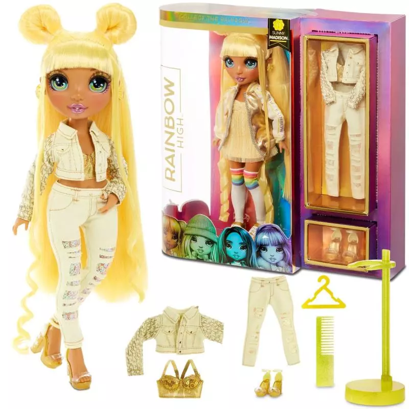 Poznajcie Sunny Madison. Ubiera się cała na żółto, ma niezwykłej urody dające się czesać włosy, a jej twarz zdobią długie rzęsy. Ponadto posiada super funkcje. Przeguby kończyn umożliwiają ustawienie jej w dowolnej pozie. Ramiona i nogi zginają się, gdy nadajesz lalce kolejną efektowną pozę. Sunny ma 2 komplety ubrań, których elementy możesz zamiennie stosować, dowolnie je wymieniać i dobierać, nadając lalce wygląd, który nie pozwoli przejść obok niej obojętnie. Sunny ubiera się uroczo, choć nieco dziwacznie. Jej wygląd wzbudza serdeczne uśmiechy przyjaciółek. Ubierz ją w błyszczącą sukienkę, jedną z dwóch kurtek, tęczowe skarpetki, błyszczące dżinsy i dodatki. Tęczowe platformy wzniosą Sunny na wyżyny szyku! W zestawie ponadto grzebień, dwa wieszaki i podstawka na lalkę. Stwórz kolekcję 6 lalek: Ruby Anderson, Poppy Rowan, Sunny Madison, Jade Hunter, Skyler Bradshaw i Violet Willow. Lalki sprzedawane oddzielnie, w zależności od dostępności.