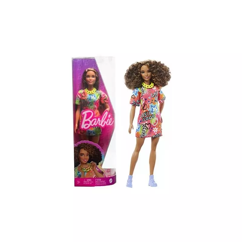 Barbie Fashionistas ubrana jest w stylową sukienkę z motywem graffiti, która przyciąga uwagę i podkreśla jej indywidualność.