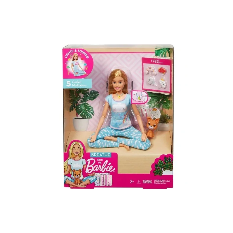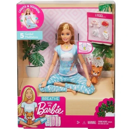 Lalka Barbie wie, że aby być najlepszą wersją siebie, trzeba o siebie zadbać! Ta lalka z motywem medytacji, światłami i dźwiękami uczy dzieci ulubionego sposobu Barbie na odprężenie – relaksującej medytacji. Zestaw zawiera lalkę Barbie, szczeniaczka i cztery chmurki z buźką. Wystarczy nacisnąć przycisk w naszyjniku lalki Barbie, aby uruchomić jedno z pięciu ćwiczeń medytacyjnych z dźwiękami i światłami, aby inspirować dzieci do odbycia własnej odprężającej sesji. Szczeniaczek pomaga Barbie w wizualizacji – przyczep do jego główki jedną z chmurek z buźką, które symbolizują myśli podczas medytacji, a potem zmień ją na inną. Lalka jest ubrana w wygodny strój sportowy i ma dodatkowe punkty zgięcia, umożliwiające przyjmowanie realistycznych póz w trakcie aktywnej zabawy. Dzieci mogą zebrać wszystkie relaksujące się lalki Barbie, aby nauczyć się, jak dbać o swoje dobre samopoczucie. Gdy dziewczynki bawią się Barbie, odkrywają, że mogą być kim chcą!