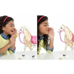 Przeżyj radość, jaką daje jazda konna dzięki zabawie z Interaktywnym Koniem Barbie. Interaktywny Koń Barbie reaguje na dotyk i dźwięk – oferuje ponad 30 realistycznych zachowań. Ten niezwykły konik potrafi iść stępa, obrócić się o 360 stopni i radośnie zarżeć w trakcie zabawy. Interaktywny Koń potrafi także „jeść”i słodko ocierać się pyszczkiem w odpowiedzi na Twój dotyk. Konik potrafi przytaknąć lub potrząsnąć przecząco głową w odpowiedzi na zadane pytanie.