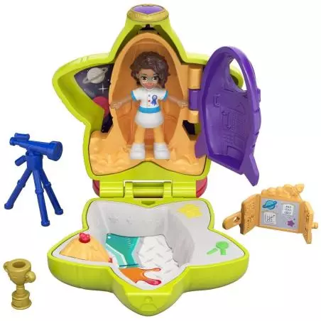 Wybierz się razem z Shani na Księżyc w skonstruowanej przez nią rakiecie! Shani to nie tylko utalentowany muzyk, ale także naukowiec. Uwielbia śpiewać, gra na wielu instrumentach, czym zawsze zachwyca swoją publiczność. W wolnych chwilach lubi jednak zgłębiać tajniki nauki. Jej obsesją jest kosmos. W mini świecie skonstruowała nawet fioletową rakietę. W zestawie znajdziesz małe, kompaktowe pudełeczko w kształcie gwiazdki. Możesz go doczepić do paska, piórnika czy plecaka. W środku znajdują się akcesoria do kreatywnej zabawy – m.in. otwierana rakieta. Do kompletu dołączono maleńką laleczkę Shani oraz mini gadżety, m.in. luneta, puchar i notes. Mieliście już okazję poznać Polly Pocket?