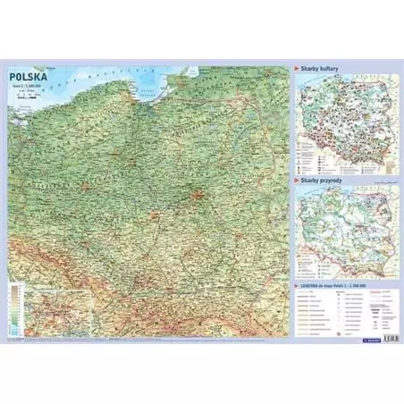 Polska - mapa w skali 1 : 1 500 000 - fizyczna Oprócz szczegółowego barwnego obrazu ukształtowania powierzchni zawiera sieć rzeczną i jeziora, opisy krain geograficznych,