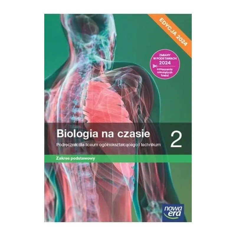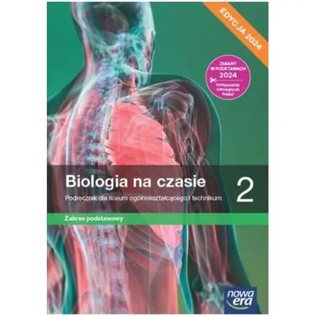 Edycja 2024. Publikacje dostosowane do zmian w podstawie programowej z 2024 r. Zawierają czytelne oznaczenia treści, które od września 2024 r. już nie obowiązują. Podręcznik „Biologia na czasie 2” do zakresu podstawowego: Zawiera treści dotyczące budowy i funkcjonowania organizmu człowieka zilustrowane atrakcyjnymi infografikami, dzięki