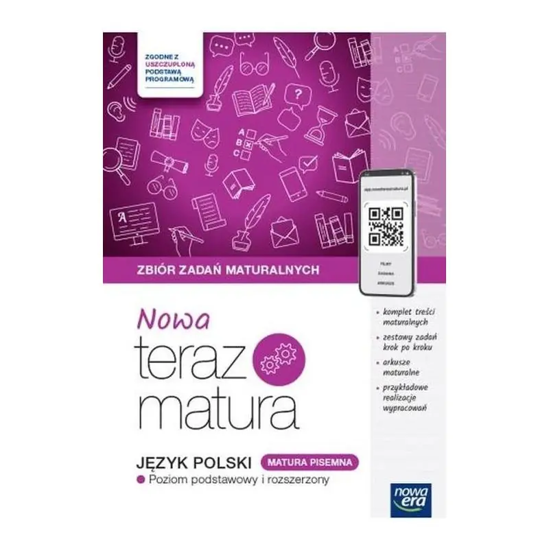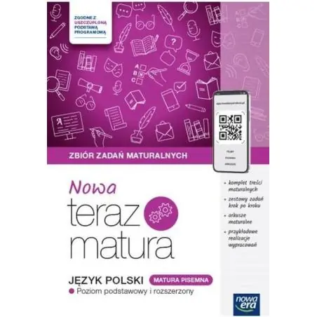 Zbiór zadań do matury pisemnej „NOWA Teraz matura. Język polski. Do matury 2025” z dostępem do materiałów cyfrowych umożliwia ćwiczenie rozwiązywania różnego typu zadań maturalnych i pracę z arkuszami. Zgodne z uszczuploną podstawą programową. kompletna baza ćwiczeniowa przykładowe realizacje zadań ze wskazówkami arkusze maturalne z