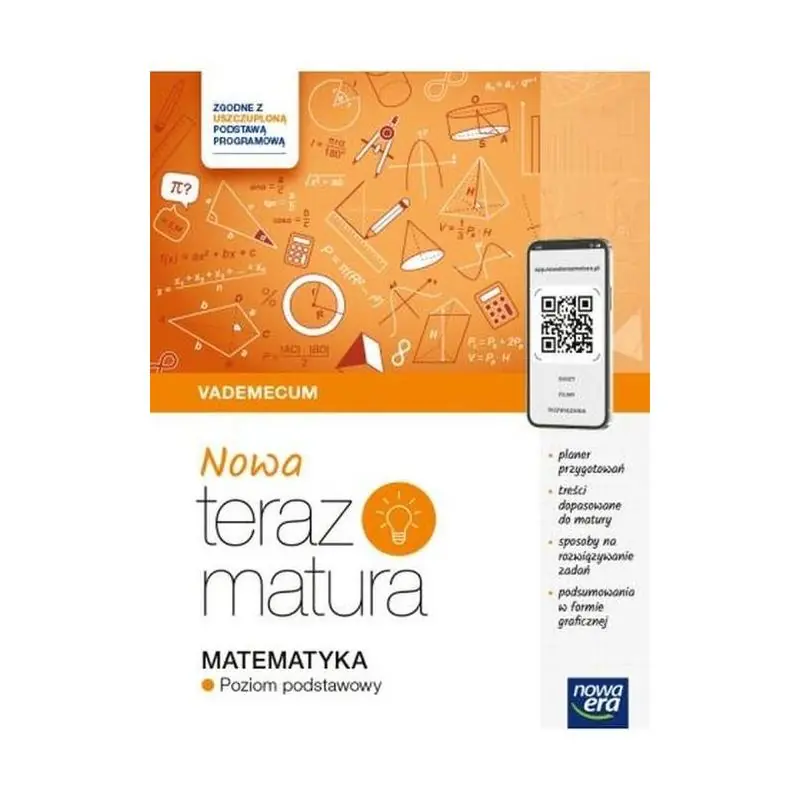 Vademecum „NOWA Teraz matura. Matematyka. Poziom podstawowy” pozwala uporządkować i powtórzyć treści przedmiotowe oraz zapoznać się ze sposobami rozwiązywania zadań egzaminacyjnych. Zgodne z uszczuploną podstawą programową. planer – lista najważniejszych zagadnień wiadomości teoretyczne dopasowane do wymagań egzaminacyjnych