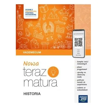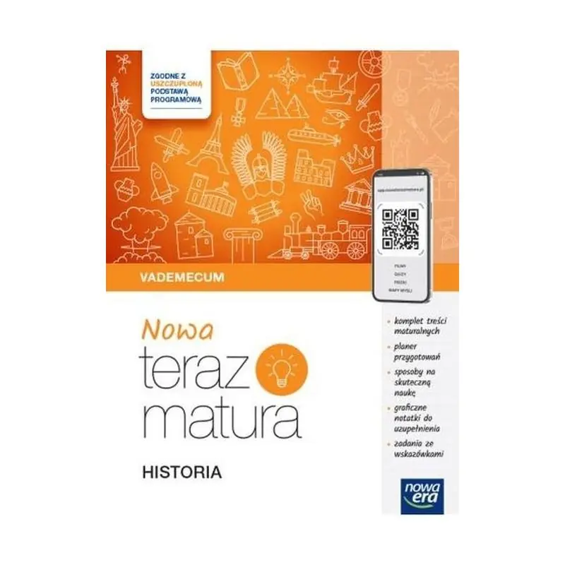 Vademecum „NOWA Teraz matura. Historia” pozwala uporządkować i powtórzyć treści przedmiotowe oraz zapoznać się ze sposobami rozwiązywania zadań egzaminacyjnych. Zgodne z uszczuploną podstawą programową. planer – lista wymaganych zagadnień cała wymagana teoria w jednym miejscu i w skondensowanej postaci dostęp do materiałów cyfrowych