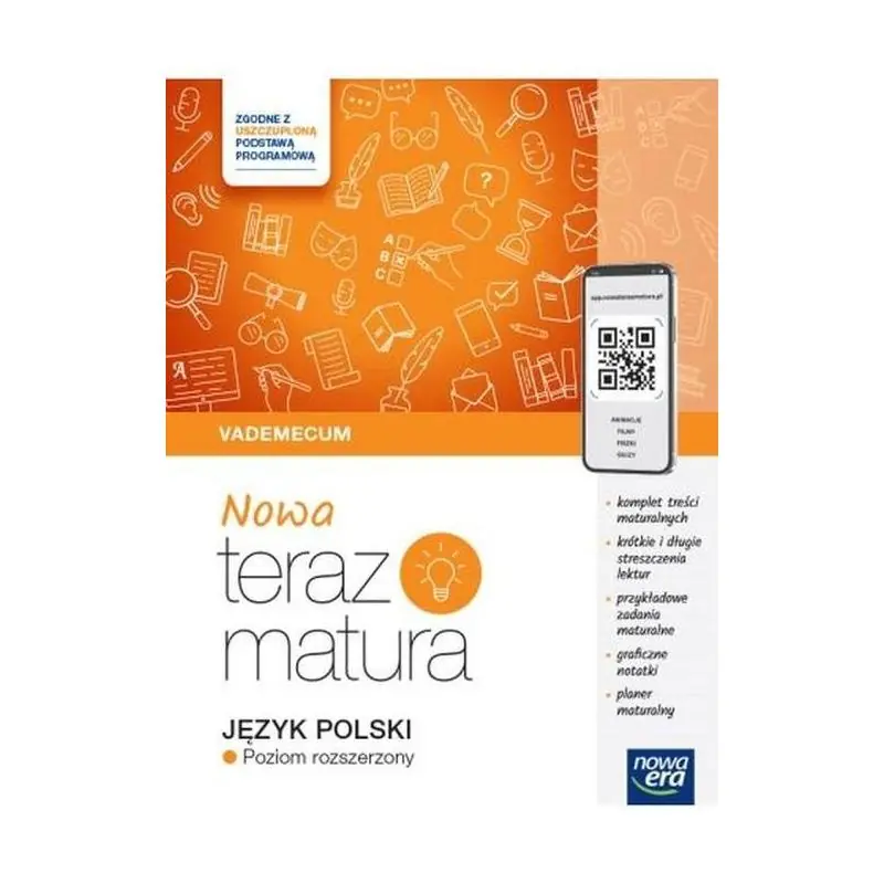 Vademecum „NOWA Teraz matura. Język polski” pozwala powtórzyć treści przedmiotowe oraz zapoznać się ze sposobami rozwiązywania zadań egzaminacyjnych. Zgodne z uszczuploną podstawą programową. komplet wymaganej teorii i wiedzy o lekturach w jednym miejscu dostęp do materiałów cyfrowych, m.in.: quizów i animacji do lektur, fiszek i filmów