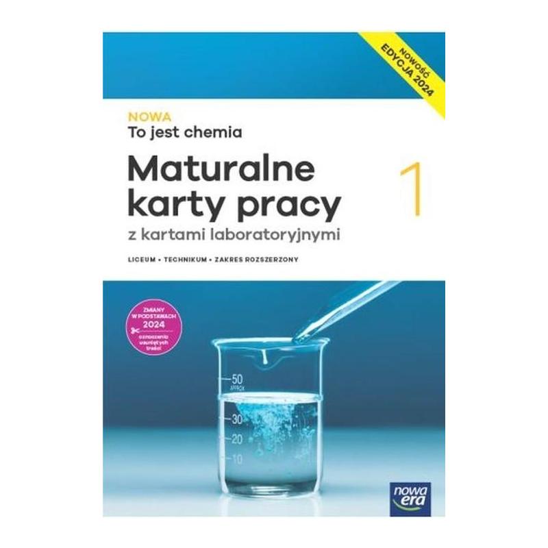 Edycja 2024. Publikacje dostosowane do zmian w podstawie programowej z 2024 oznaczono dopiskiem "Edycja 2024". Nowe "Maturalne karty pracy z kartami laboratoryjnymi", skorelowane z podręcznikiem "NOWA To jest chemia 1", ułatwiają systematyczne przygotowywanie do matury już od 1 klasy. Zawierają aktualne dane zgodne z tablicami chemicznymi CKE oraz nazewnictwo związków chemicznych zgodne z zaleceniami IUPAC. W publikacji znajdują się kody dostępu do filmów z obowiązkowymi doświadczeniami chemicznymi. Zadania typu maturalnego uporządkowane według działów i tematów z podręcznika oraz zadania CKE do każdego działu pomagają w utrwaleniu zagadnień omawianych na lekcji oraz w stopniowym rozwijaniu umiejętności rozwiązywania zadań. Karty laboratoryjne kształcą umiejętność rozwiązywania zadań dotyczących opisu, projektowania i prezentacji wyników doświadczeń. Wskazówki matematyczne i Przykłady rozwiązane krok po kroku ułatwiają osiągnięcie biegłości w rozwiązywaniu zadań obliczeniowych. Zadania CKE z arkuszy maturalnych To było na maturze! oswajają uczniów z typami zadań maturalnych i formą egzaminu już od klasy 1.
