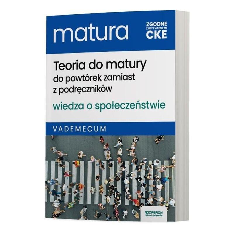 Vademecum – zbiór najważniejszych wiadomości niezbędnych na egzaminie maturalnym – pozwalający na naukę w takim rytmie, jakiego potrzebujesz. Zawiera: kompendium wiedzy podzielone na działy takie jak w repetytorium, podane syntetycznie jako podsumowanie całego cyklu nauki; często w formie zestawień najważniejszych treści, wykresów i tabel, a także ich omówień stanowiących komentarz wystarczający do zrozumienia zagadnienia definicje i pojęcia wyróżnione w każdym dziale kolorową czcionką, co ułatwia ich zapamiętywanie graficzne ilustracje zaprezentowano wszędzie tam, gdzie ułatwiają zrozumienie zjawisk, procesów i reakcji chemicznych wybrane wzory pism stanowiące cenne źródło do zapoznania się i wykorzystania w zadaniach maturalnych rozszerzonej odpowiedzi teksty Konstytucji Rzeczypospolitej Polskiej oraz Powszechnej Deklaracji Praw Człowieka to jedne z wielu treści źródłowych, z których potrzebujesz korzystać podczas nauki