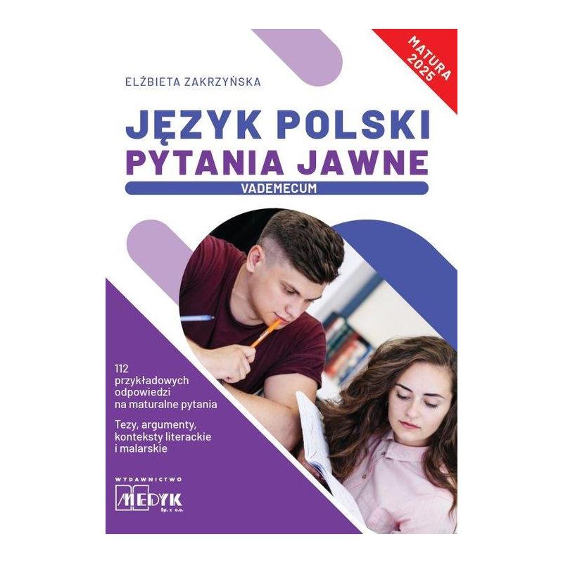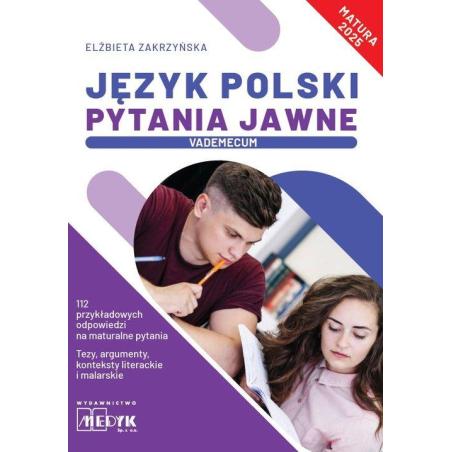 Vademecum przeznaczone jest dla każdego maturzysty. Zawiera opracowanie 112 pytań z puli pytań jawnych na maturę ustną z języka polskiego obowiązujących w roku 2025. Umożliwia przyswojenie niezbędnej wiedzy z różnych epok – od antyku do literatury współczesnej. Przedstawia przykładowe tezy, argumenty, konteksty literackie i malarskie. Dzięki tej publikacji maturzyści będą mogli przygotować merytoryczną i konstruktywną egzaminacyjną wypowiedź monologową. Świat ucznia zdominowany przez przekaz internetowy, tik-tokowy, social media, przez kulturę obrazu niewiele miejsca pozostawia literaturze. Jednak – czytam, więc jestem. Niech ten sparafrazowany kartezjuszowski aforyzm przyświeca uczniowskiej edukacji i nie tylko jej… Elżbieta Zakrzyńska Absolwentka Uniwersytetu Warszawskiego, historyczka literatury, eseistka, wieloletnia nauczycielka licealna, egzaminatorka maturalna.