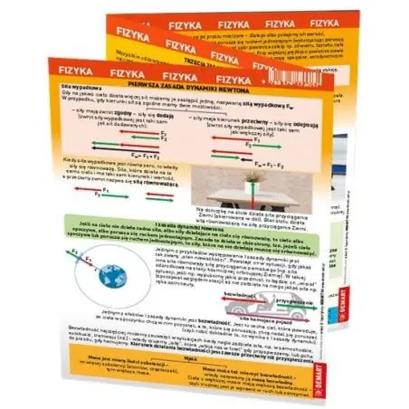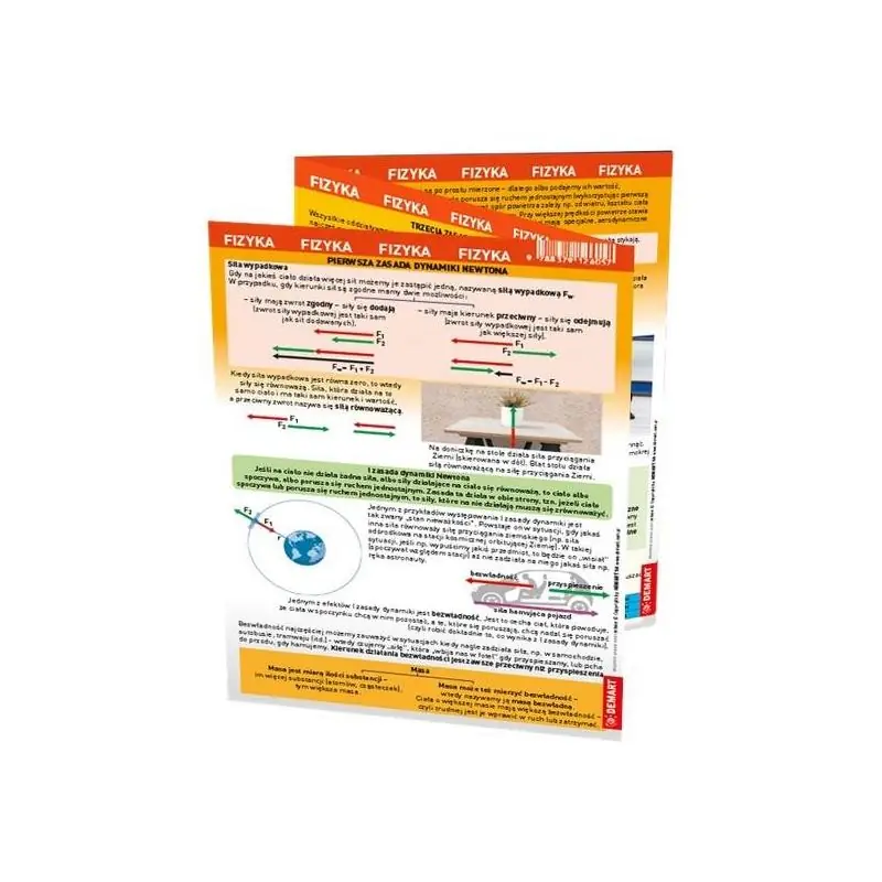 Fizyka - laminowana, składana, trzykartkowa ściągawka - pomoc na lekcji, podczas odrabiania pracy domowej, a także w przygotowaniach do sprawdzianu. Zawiera omówienie trzech zasad dynamiki Newtona, prawo Pascala i prawo Archimedesa.