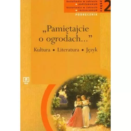 Drugi z trzech planowanych podręczników w cyklu "Pamiętajcie o ogrodach...", obejmujący zjawiska kulturowo-literackie i językowe w okresie od lat dwudziestych XIX wieku (początek polskiego romantyzmu) do lat dwudziestych wieku XX (nurt tradycyjny w dwudziestoleciu). z założeniami cyklu układ treści jest problemowo-chronologiczny, a kształcenie językowe; ściśle powiązane z kształceniem historycznoliterackim. e dzieł wsparto wieloma cytatami, zwłaszcza fragmentami utworów poetyckich. Każdą z całości tematycznych opatrzono pytaniami, poleceniami dla ucznia, wskazówkami lekturowymi. Liczne ilustracje (przede wszystkim reprodukcje dzieł malarskich) często są samodzielnym przedmiotem analizy.ci przeznaczone do kształcenia w zakresie rozszerzonym są wyodrębnione graficznie, tak jak w podręczniku dla klasy 1. Do kształcenia rozszerzonego niezbędna jest antologia, wydana oddzielnie.