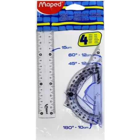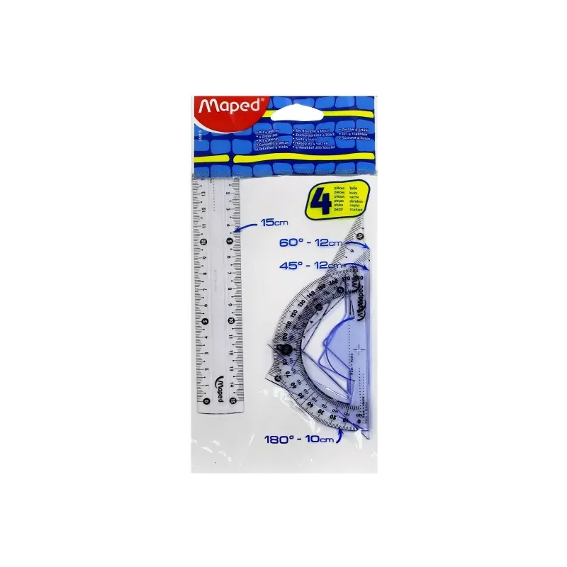 • zawiera:  1 linijkę 15 cm, 1 ekierkę 45° - 15 cm, 1 ekierkę 60° - 15 cm, 1 kątomierz 180° - 10 cm