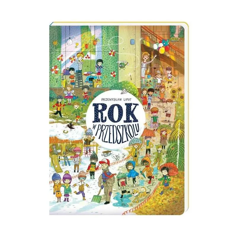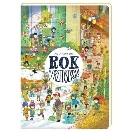 Witajcie w naszym przedszkolu! Tu się uczymy i bawimy. Ignaś lubi grać w piłkę, Maks jest specjalistą od dinozaurów, z Krzysiem, moim ulubionym kolegą, wciąż robimy jakieś kawały. Zosia z kolei wiecznie coś gubi, a Wiktoria wydaje przyjęcia dla lalek… Nawet mały Aleks zostawia czasem swoją poduszkę bezpieczeństwa i do nas dołącza. Poza panią Anią, wychowawczynią, są jeszcze pan Marcel i jego pies Bazyl. Dbamy też o kotkę Felkę – psotnica ciągle się chowa, a my jej szukamy. Chodźcie, musicie wszystkich poznać! „Rok w przedszkolu” zawiera dwanaście rozkładówek wprowadzających dziecko w życie przedszkolne. Miesiąc po miesiącu towarzyszymy bohaterom w czasie najważniejszych świąt i uroczystości. Obserwujemy codzienne zabawy i naukę. Dwie rozkładówki są poświęcone prezentacji bohaterów oraz interaktywnej zabawie. Dzięki szczegółowym obrazkom dziecko ćwiczy spostrzegawczość, umiejętność opowiadania, ale przede wszystkim doskonale się bawi, odkrywając szczegóły kolorowych ilustracji. Przemysław Liput – ur. w 1985 r. w Sanoku. W 2010 roku ukończył studia na kierunku Grafika na Wydziale Sztuki Uniwersytetu Pedagogicznego w Krakowie. Dyplom magisterski w pracowni druku cyfrowego pt. „Niedobici”. Jest autorem ilustracji do książek. Od 2011 prowadzi zajęcia z filmu animowanego na Wydziale Sztuki Uniwersytetu Pedagogicznego w Krakowie. Realizuje prace w technikach graficznych, rysunkowych oraz wideo. W filmie animowanym interesuje się działaniami bezkamerowymi i przedkinematograficznymi.