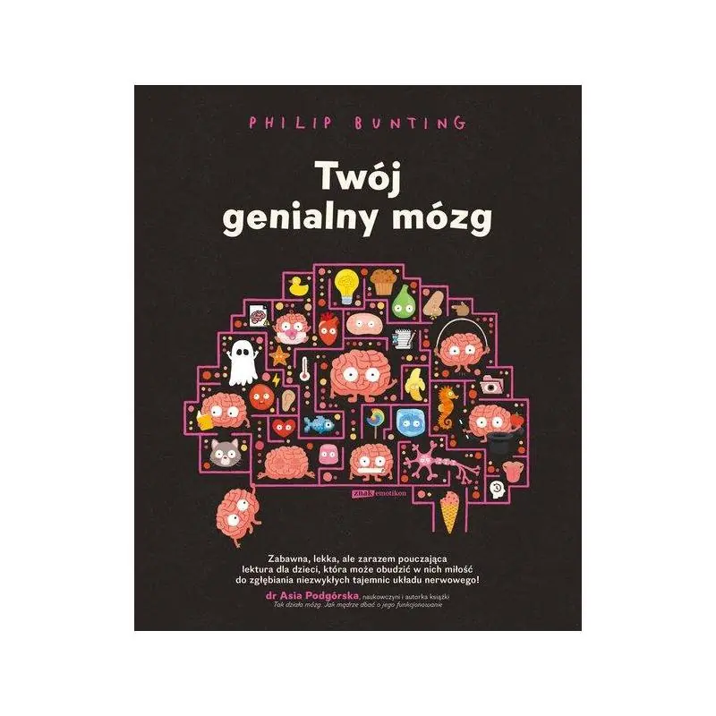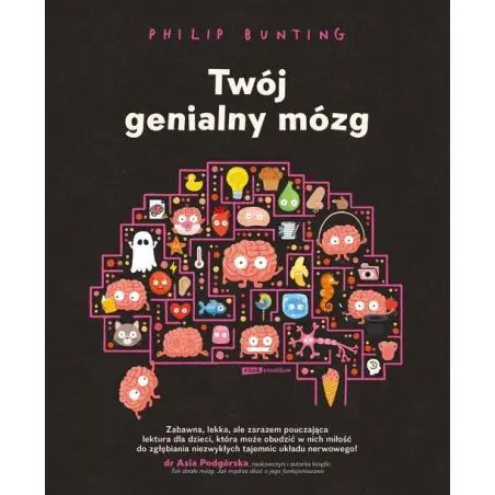 „Zabawna, lekka, ale zarazem pouczająca lektura dla dzieci, która może obudzić w nich miłość do zgłębiania niezwykłych tajemnic układu nerwowego!” – dr Asia Podgórska, naukowczyni i autorka książki „Tak działa mózg. Jak mądrze dbać o jego funkcjonowanie”. Jeśli to czytasz, to znaczy, że masz niesamowite szczęście! Masz mózg, czyli najcudowniejszy i najbardziej tajemniczy organ w całym kosmosie! Wiesz, że twój mózg jest zdolny pomieścić więcej informacji, niż znajduje się obecnie w całym internecie? Która część mózgu sprawia, że nie musisz się codziennie przedstawiać rodzinie i przyjaciołom? Dlaczego za kopanie piłki prawą nogą odpowiada lewa półkula? Gdzie rodzą się emocje: w mózgu czy w sercu? Co by się stało, gdybyśmy sami musieli dbać o to, żeby nasze serce biło, albo o to, żebyśmy nie zapomnieli oddychać? Dlaczego mózg to wielki iluzjonista, dzięki któremu widzisz rzeczy, które mogą nie być prawdziwe?