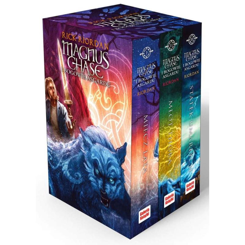Trzy tomy bestsellerowej serii "Magnus Chase i bogowie Asgardu" w specjalnie zaprojektowanym pudełku.