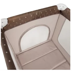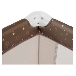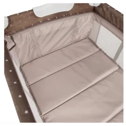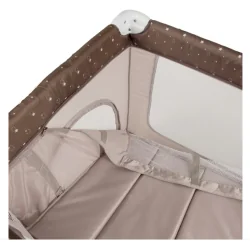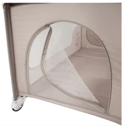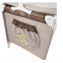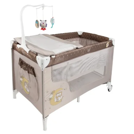 Łóżeczko turystyczne Smiki 120 × 60 cm w eleganckim odcieniu beżu łączy funkcję miejsca do spania z mobilnym centrum pielęgnacji. Dzięki wbudowanemu przewijakowi i karuzeli z zabawkami maluch odpoczywa, bawi się i jest przewijany w jednym, bezpiecznym miejscu – zarówno w domu, jak i