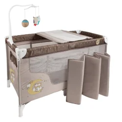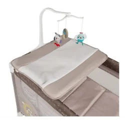 Łóżeczko turystyczne Smiki 120 × 60 cm w eleganckim odcieniu beżu łączy funkcję miejsca do spania z mobilnym centrum pielęgnacji. Dzięki wbudowanemu przewijakowi i karuzeli z zabawkami maluch odpoczywa, bawi się i jest przewijany w jednym, bezpiecznym miejscu – zarówno w domu, jak i w podróży.