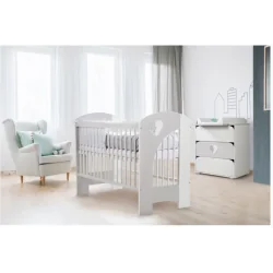 Łóżeczko dziecięce Klupś Nel Serce 120x60 cm w kolorze biało-popielatym to połączenie eleganckiego designu i praktycznych rozwiązań. Wykonane z drewna sosnowego, płyty MDF i płyty eko, zapewnia trwałość, bezpieczeństwo oraz wygodę codziennego użytkowania. Dzięki trzem poziomom regulacji wysokości dna i wyjmowanym szczebelkom, łóżeczko