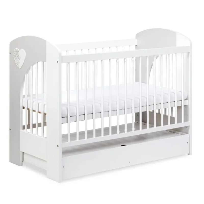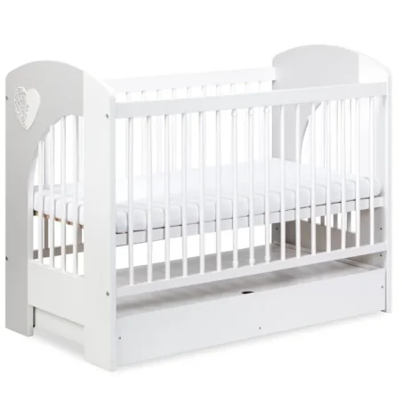 Łóżeczko dziecięce Klupś Nel Serce 120x60 cm w kolorze biało-popielatym to połączenie eleganckiego designu i praktycznych rozwiązań. Wykonane z drewna sosnowego, płyty MDF i płyty eko, zapewnia trwałość, bezpieczeństwo oraz wygodę codziennego użytkowania. Dzięki trzem poziomom regulacji wysokości dna i wyjmowanym szczebelkom, łóżeczko rośnie razem z dzieckiem i dostosowuje się do jego potrzeb. Dodatkowo pojemna szuflada pozwala przechowywać pościel i akcesoria, oszczędzając miejsce w pokoju dziecięcym.