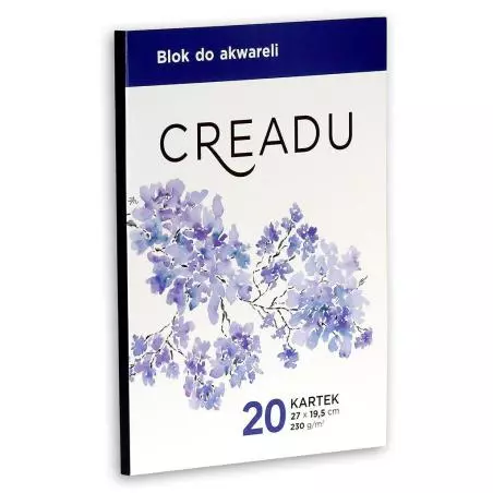 Blok do akwareli marki Creadu składa się z 20 arkuszy o wymiarach 27 cm na 19,5 cm. Jest to papier o gramaturze 230 g/m2 zapewniającej odpowiednią odporność na wilgoć oraz sprzyjającą absorpcję farb, co pozwala na uzyskanie wyraźnych, klarownych kolorów i płynnych przejść pomiędzy nimi.