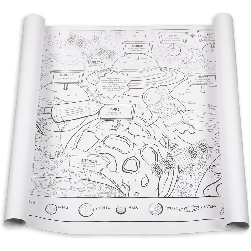 - Zestaw zawiera 2 arkusze o wymiarach 100 x 70 cm przedstawiające kosmos.