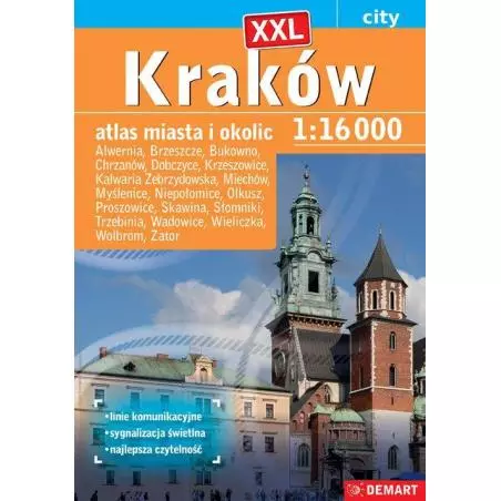 Atlas Krakowa w skali 1:16 000 plus centrum w skali 1:10 000, wzbogacony o plany 19 okolicznych miast. - Mapa okolic w skali 1:12 500 - Ulice jednokierunkowe - Strefy ruchu pieszego - Strefy ograniczonego ruchu i postoju - Strefy ograniczonego postoju - Granice dzielnic Krakowa - Sygnalizacja świetlna - Linie komunikacyjne (autobusowe, tramwajowe) - Spisy ulic miast - Ścieżki rowerowe, szlaki turystyczne, miejskie trasy turystyczne Krakowa - Rysunki i opisy wybranych zabytków Krakowa.