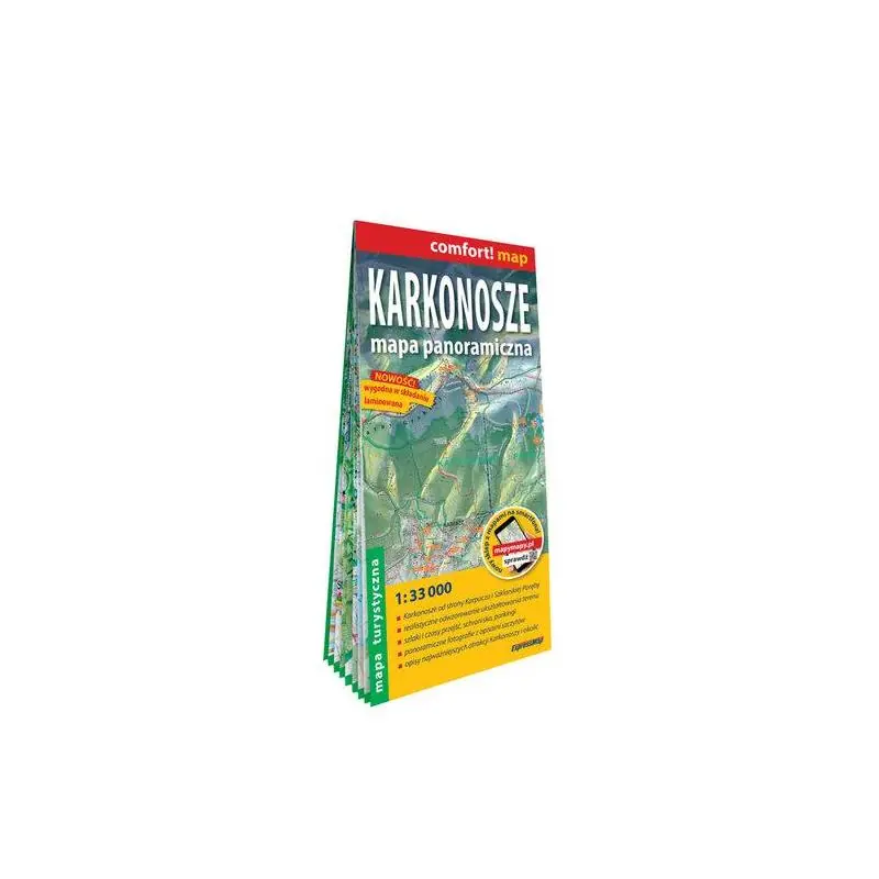 Karkonosze. Mapa panoramicznaKarkonosze. Mapa panoramiczna to wyjątkowa publikacja ukazująca najwyższe pasmo Sudetów w orientacji południowej, czyli widziane od strony Karpacza i Szklarskiej Poręby. Takie rozwiązanie znacznie ułatwia korzystanie z mapy wszystkim wyruszającym w góry z Kotliny Jeleniogórskiej. Kolejnym atutem mapy jest zastosowanie rzutu panoramicznego do prezentacji ukształtowania terenu, co w połączeniu z cieniowaniem dało niezwykle realistyczny efekt przestrzenny przypominający widok na góry z lotu ptaka. Jednocześnie mapa prezentuje niezbędne dla turysty elementy, m.in.: - szlaki i czasy przejść, - schroniska turystyczne, wiaty, - parkingi, przystanki autobusowe, postoje dorożek, - wodospady, formacje skalne, rezerwaty przyrody, - muzea, zabytki (w tym liczne zamki) i inne interesujące turystycznie obiekty.Na odwrocie mapy zamieszczono panoramiczne fotografie najpiękniejszych karkonoskich krajobrazów wraz z opisami szczytów. Punkty, z których wykonano zdjęcia, zostały oznaczone na mapie. Fotografiom towarzyszą opisy najatrakcyjniejszych miejsc Karkonoszy i regionu oraz mapa okolic pasma.Karkonosze. Mapa panoramiczna to unikalna na rynku propozycja zarówno dla turystów zaczynających swoją przygodę z Karkonoszami, jak i wytrawnych wędrowców, którzy dzięki niej spojrzą na góry z nowej perspektywy.Wyjątkowość map panoramicznych Wydawnictwa ExpressMap została doceniona w licznych konkursach i przeglądach o tematyce turystycznej, na których zdobyły wiele nagród i wyróżnień, np.: Tatry. Mapa panoramiczna – 1. miejsce w kategorii mapy i atlasy, XXVIII Ogólnopolski Przegląd Książki Krajoznawczej i Turystycznej, Międzynarodowe Targi Poznańskie, Beskid Śląski i Mały. Mapa panoramiczna – 1. miejsce w kategorii mapy, Najlepsze wydawnictwa o górach (2019-2023), Centralny Ośrodek Turystyki Górskiej PTTK oraz Nagroda główna w kategorii mapa i plan turystyczny, Najlepsze publikacje turystyczne 2023 roku, Biblioteka Analiz.W serii map panoramicznych ukazały się mapy Tatr, Bieszczadów, Beskidu Śląskiego i Małego, Gorców i Pienin oraz ziemi kłodzkiej.