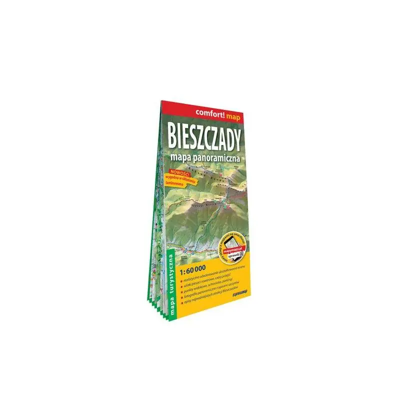 Bieszczady. Mapa panoramicznaBieszczady. Mapa panoramiczna to wyjątkowa publikacja, w której zastosowano rzut panoramiczny do prezentacji ukształtowania terenu, co w połączeniu z cieniowaniem dało niezwykle realistyczny efekt przestrzenny przypominający widok na góry z lotu ptaka.Jednocześnie mapa prezentuje wszystkie niezbędne dla turysty elementy, m.in.: • szlaki i czasy przejść, • szlaki rowerowe, szlaki kajakowe, ścieżki dydaktyczne i spacerowe, • schroniska turystyczne, wiaty, • obszary „Zanocuj w lesie”, • parkingi, przystanki autobusowe, bankomaty, • punkty i wieże widokowe, • atrakcje przyrodnicze, • muzea, zabytki i inne interesujące turystycznie obiekty.Na odwrocie mapy zamieszczono panoramiczne fotografie najpiękniejszych bieszczadzkich krajobrazów wraz z opisami szczytów. Punkty, z których wykonano zdjęcia, zostały oznaczone na mapie. Fotografiom towarzyszą opisy najatrakcyjniejszych miejsc regionu oraz turystyczno-samochodowa mapa okolic Bieszczadów.Bieszczady. Mapa panoramiczna to unikalna na rynku propozycja zarówno dla turystów zaczynających swoją przygodę z Bieszczadami, jak i wytrawnych wędrowców, którzy dzięki niej spojrzą na góry z nowej perspektywy.Mapa otrzymała wyróżnienie w kategorii mapa i plan turystyczny – Najlepsze publikacje turystyczne 2021 roku, Biblioteka Analiz.W serii map panoramicznych ukazały się także mapy Tatr, Karkonoszy, Gorców i Pienin, Beskidu Śląskiego i Małego, ziemi kłodzkiej.