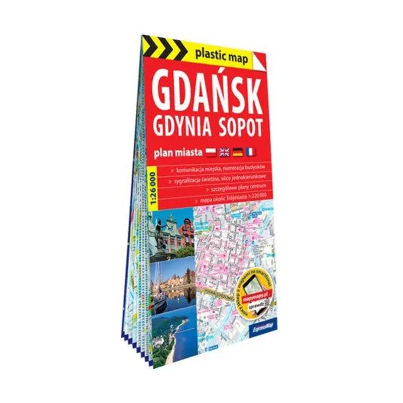 Gdańsk, Gdynia, Sopot Wizyta w Stoczni Gdańskiej, zwiedzanie okrętu ORP Błyskawica w Gdyni, a może spacer po sopockim molo? Dwustronnie foliowany, trwały plan Trójmiasta pomoże dotrzeć do wszystkich ciekawych zakątków. Na planie m.in.: • szczegółowy rysunek zabudowy wraz z numeracją budynków wzdłuż ulic i na osiedlach, • linie