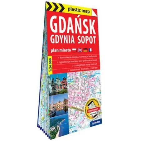 Gdańsk, Gdynia, Sopot Wizyta w Stoczni Gdańskiej, zwiedzanie okrętu ORP Błyskawica w Gdyni, a może spacer po sopockim molo? Dwustronnie foliowany, trwały plan Trójmiasta pomoże dotrzeć do wszystkich ciekawych zakątków. Na planie m.in.: • szczegółowy rysunek zabudowy wraz z numeracją budynków wzdłuż ulic i na osiedlach, • linie autobusowe, trolejbusowe i tramwajowe wraz z przystankami, • sygnalizacja świetlna, ulice jednokierunkowe, parkingi, granica strefy płatnego parkowania, • bogata treść turystyczna, m.in.: zabytki, muzea, szlaki turystyczne, hotele i inne istotne obiekty, • granice parków krajobrazowych i rezerwatów przyrody, • budynki użyteczności publicznej, centra handlowe, • szczegółowe plany centrum Gdańska, Gdyni i Sopotu w skali 1:13 000 (1 cm – 130 m), • mapa samochodowa okolic Trójmiasta w skali 1:220 000 (1 cm – 2,2 km), • skorowidz ulic.