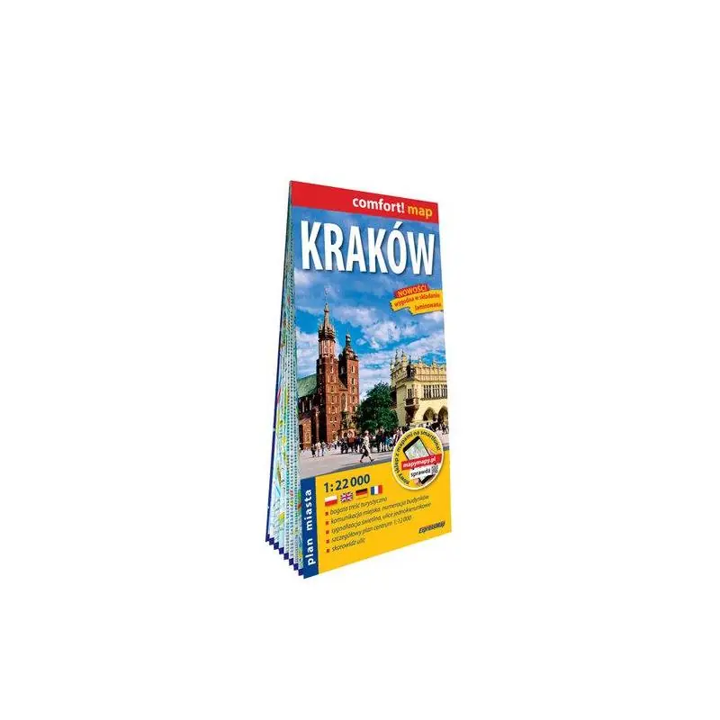 Kraków Spotkanie oko w oko ze Smokiem Wawelskim, spacer po Rynku, wizyta w Fabryce Schindlera, podziwianie widoków z Kopca Kościuszki. W Krakowie na turystów czeka wiele atrakcji. Dwustronnie laminowany, trwały i wygodny w użytkowaniu plan stolicy Małopolski pomoże je odnaleźć. Na planie m.in.: • szczegółowy rysunek zabudowy wraz z numeracją budynków wzdłuż ulic i na osiedlach, • linie autobusowe i tramwajowe wraz z przystankami, • sygnalizacja świetlna, ulice jednokierunkowe, parkingi, • bogata treść turystyczna, m.in.: zabytki, muzea, hotele i inne istotne obiekty, • budynki użyteczności publicznej, centra handlowe, • szczegółowy plan Starego Miasta w skali 1:12 000 (1 cm – 120 m), • skorowidz ulic. "