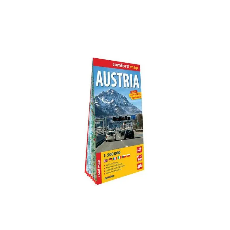 Z dwustronnie laminowaną, wygodną w składaniu mapą samochodową Austrii podróż po tym kraju będzie prawdziwą przyjemnością. Oprócz aktualnych informacji drogowych zaznaczono na niej także ośrodki narciarskie wraz z największymi wyciągami oraz opisano główne pasma górskie, najważniejsze szczyty i przełęcze.