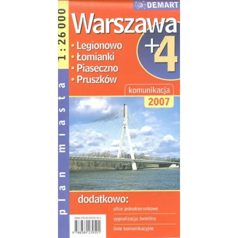 Plan Warszawy w skali 1:26 000 plus centrum w skali 1:15 000 Wzbogacony o plany najważniejszych miast w okolicy.- Ulice jednokierunkowe- Sygnalizacja świetlna- Linie komunikacyjne- Spisy ulic i informacje teleadresowe okolicznych miast.