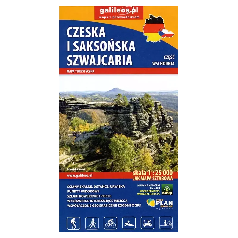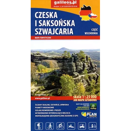 Część kartograficzna obejmuje pogranicze Czeskiej i Saksońskiej Szwajcarii. Obejmuje wszystkie formy skalne regionu, kurorty i miasteczka oraz atrakcje przy nich, czyli: Sebnitz, Mikulovice, Hinterhermsdorf, Jetichovice, Rov oraz Kuhnstal, Pravicka brana, Idaggrottę, Affelteione, spływy łodziami i inne. Zawiera szlaki piesze i rowerowe oraz wszystkie informacje potrzebne turyście. Mapa opisana na siatce WGS 84, zgodna z polskimi systemami nawigacyjnymi.