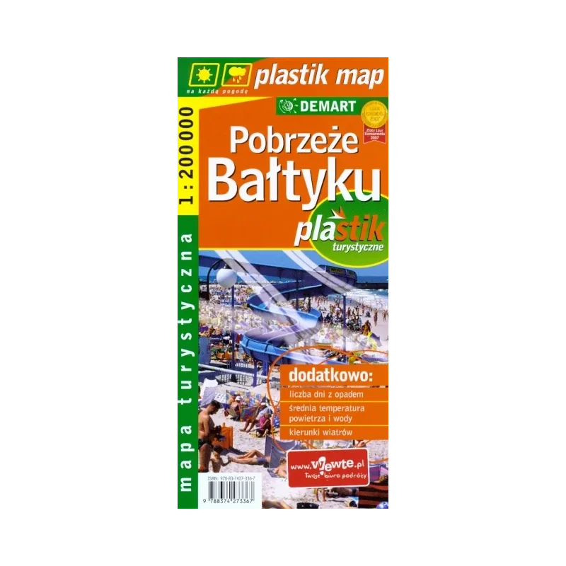 Pobrzeże Bałtyku – turystyczna mapa laminowana w skali 1:200 000. Swoim zasięgiem obejmuje całe polskie wybrzeże Bałtyku. Niezastąpiona dla nadmorskich wczasowiczów, którzy chcą się wybrać na samochodową, lub np. rowerową wycieczkę po okolicy. Oprócz typowej treści mapy samochodowo turystycznej w tej skali, mapa zawiera informacje o danych klimatycznych: liczba dni z opadem, średnia temperatura powietrza i wody, kierunki wiatrów. Mapa wyposażona jest w spis miejscowości. Dzięki laminowaniu jest trwalsza, nie niszczy się tak szybko na zgięciach i jest odporna na wpływ warunków atmosferycznych. •cała mapa jest laminowana•wytrzymała, wygodna w użyciu •łatwo się rozkłada i składa •pokrycie mapy folią laminowaną pozwala zaznaczać drogę na mapie, robić notatki •mapa jest mocna, nie zniszczy i nie porwie się tak szybko jak wersja papierowa Zawiera: •dla turystów pieszych, rowerowych, zmotoryzowanych czasy przejść na szlakac.