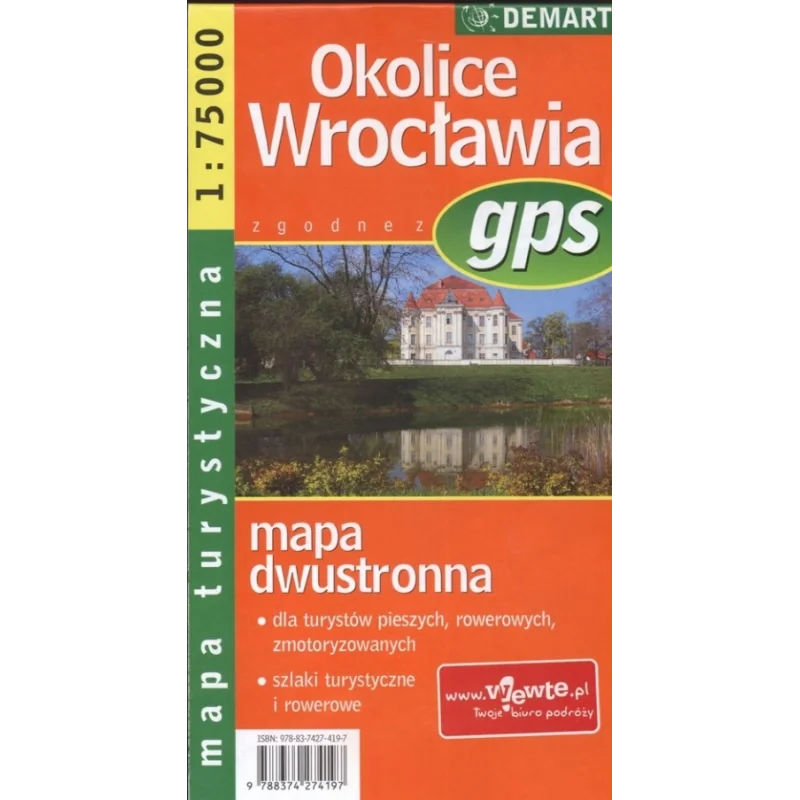 Dwustronna mapa turystyczna Okolic Wrocławia, w skali 1:75 000, obejmuje rozległe tereny pomiędzy Miliczem, a Nową Rudą oraz Brzegiem, i Oleśnicą. Treść tej mapy została dostosowana do potrzeb turystów pieszych, rowerowych i zmotoryzowanych. Precyzyjny przebieg szlaków turystycznych, lokalizacja ciekawych obiektów przyrodniczych, zabytkowych,