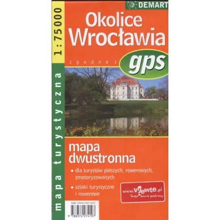 Dwustronna mapa turystyczna Okolic Wrocławia, w skali 1:75 000, obejmuje rozległe tereny pomiędzy Miliczem, a Nową Rudą oraz Brzegiem, i Oleśnicą. Treść tej mapy została dostosowana do potrzeb turystów pieszych, rowerowych i zmotoryzowanych. Precyzyjny przebieg szlaków turystycznych, lokalizacja ciekawych obiektów przyrodniczych, zabytkowych, historycznych, militarnych, kulturalnych oraz tworzących bazę noclegowo-usługową, zapewnia jej wysoką użyteczność. Dodatkowy atut stanowi siatka kilometrowa w układzie PUWG – 92 WGS84 umożliwiająca współpracę z urządzeniami do nawigacji satelitarnej (GPS).