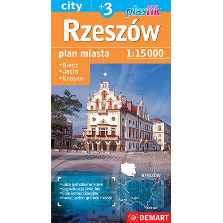 Zabezpieczony i wzmocniony przeroczystą folią (platikowy) plan Rzeszowa wykonano w skali 1:15 000, zaś centrum w skali 1:7 500.Plansza zawiera też plany trzech okolicznych miast: Jasła, Biecza i Krosna oraz mapę okolic w skali 1 : 350 000. Głównymi elementami treści planów miast są: