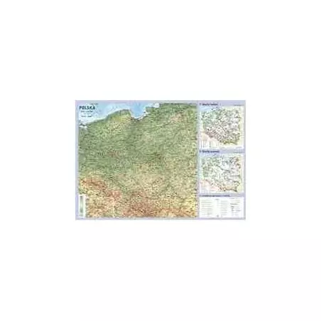 Polska - mapa ścienna w skali 1 : 1 500 000 - fizyczno-administracyjna. Oprócz szczegółowego barwnego obrazu ukształtowania powierzchni zawiera sieć rzeczną i jeziora, opisy krain geograficznych, wszystkie miasta i dużą liczbę wsi gminnych, a także aktualną sieć dróg i kolei oraz granice państw i województw
